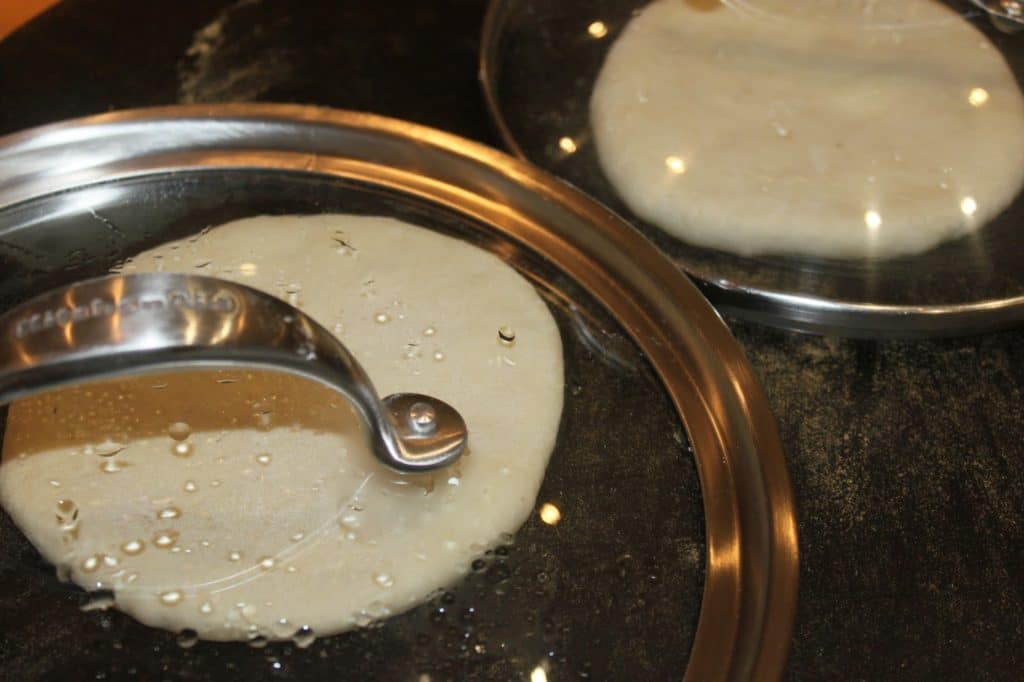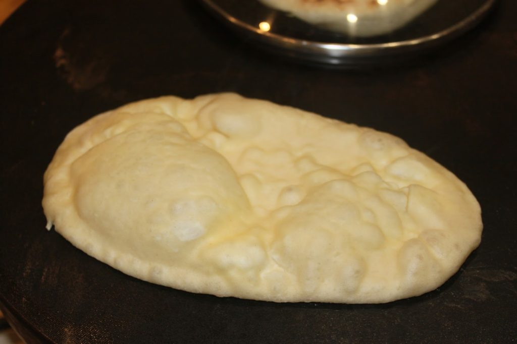 - Pour les faire cuire, rien de mieux qu’un four tandoor. Mais comme il est un peu difficile d’en mettre un chez soi, on peut le faire au mieux avec une crêpière ou encore à la pôele. J’ai une crêpière de Krampouz qui est parfaite. Ça c’est le luxe ultime. Mais une poêle ira très bien. Mettez les naans à cuire sur la plaque chaude (200°C) puis posez un couvercle.