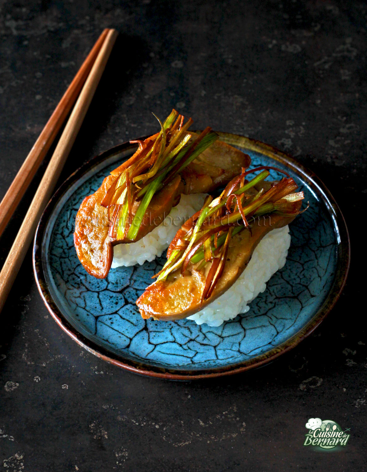 Il y a quelques temps, j’allais souvent en Asie, au Japon. J’aime tellement la cuisine de quasiment tous les pays asiatiques ! Je pense que cela se ressent dans mes livres et mon blog, mais aussi dans mes ateliers ! Ce n’est pas au Japon que j’ai découvert ces étonnants sushi, mais en Chine ! J’avoue avoir été sceptique au départ, mais comme j’aime beaucoup le foie gras poêlé, j’ai voulu tenter. Et j’ai immédiatement adoré. Les saveurs classiques d’un sushi (le riz vinaigré, la sauce de soja qui l’accompagne, le wasabi qui vient relever le tout) se mélangent à la perfection avec le foie gras, ici chaud et poêlé. Cela n’a rien de traditionnel, j’en ai bien conscience, mais comme il est peu probable que je voyage autant qu’avant, et que j’avais du foie gras cru au congélateur, j’ai voulu mettre cette recette sur mon blog.