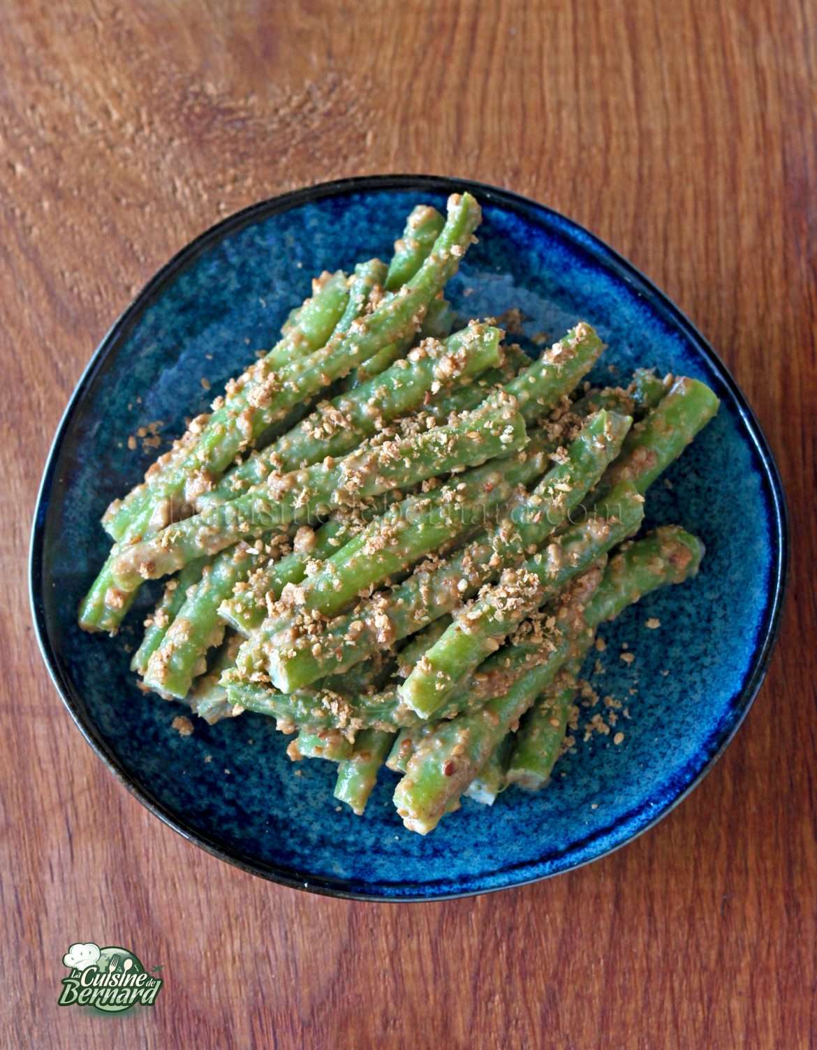 Dans un petit restaurant japonais que j’aime beaucoup, le Sake Lover (83 rue de Turbigo à Paris) que j’adore, la nourriture est traditionnelle et vous n’y trouverez que des plats excellents. Je me suis inspiré de leurs haricots que je ne manque jamais de dévorer quand ils sont à la carte. Le tout est prêt en 20 minutes. La sauce est composée de sésame bien sûr, de tahiné (la pâte de sésame) et d’huile de sésame grillé. Mais également un peu de sauce de soja et de mirin, un saké très doux pour la cuisine que vous trouverez facilement en épicerie japonaise, exotique ou asiatique, mais également sur internet.