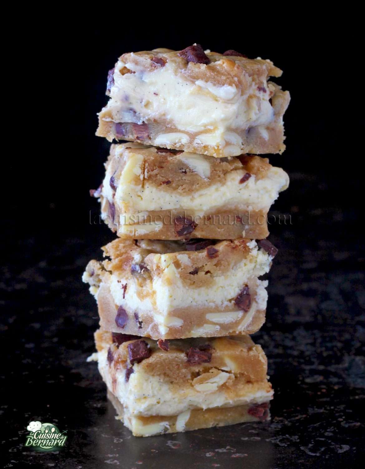 Attention ces petites parts de gâteaux sont totalement diaboliques. Cette délicieuse pâte à cookie est cuite avec un fourrage au cream cheese. C’est comme avoir une couche de cheesecake rafraichissante au milieu d’un déluge de pépites de chocolat noir et blanc. Je vous préviens tout de suite que c’est un véritable scandale, car pas vraiment recommandé juste avant l’été et les maillots de bain. Peut-être suis-je au fond un peu cruel !