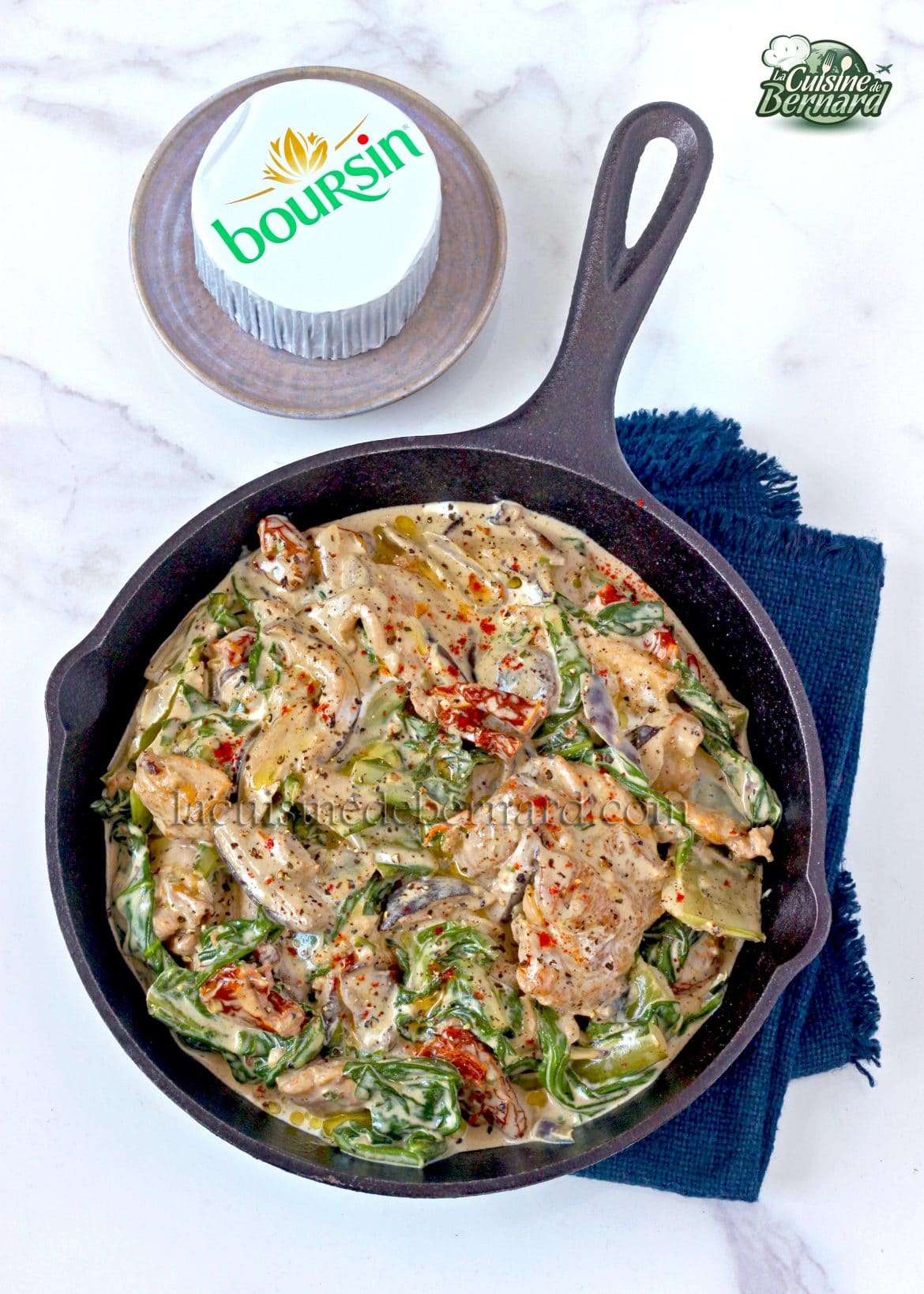 Je vous propose une deuxième recette en partenariat avec Boursin® ail et fines herbes. Après le risotto (recette ICI), je vous ai cette fois concocté une poêlée au poulet, champignons, blettes et tomates séchées, dans une sauce à la crème et au Boursin. C’est un vrai délice et se servira volontiers avec un simple riz blanc.