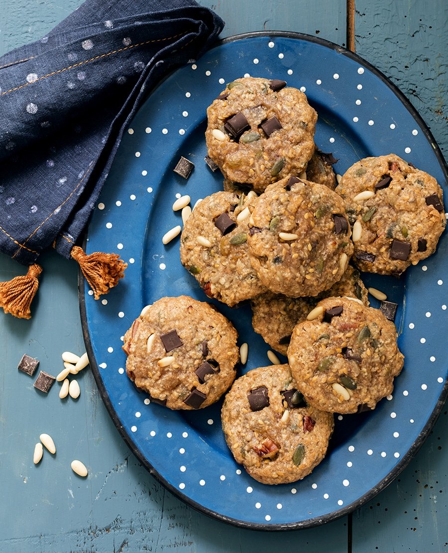 J’avais découvert à Vancouver dans un grand magasin bio, des cookies qui m’ont inspiré ceux que vous avez sous vos yeux. J’avais bien noté tous les ingrédients et je me suis retrouvé dans mon atelier avec les mêmes que ceux qui composent ces gâteaux. J’ai évidemment fait plusieurs essais de proportions et je suis arrivé à la conclusion que la version que je vous propose était en définitive encore meilleure que celle que j’avais découverte. Au petit déjeuner ou au goûter, ils sont parfaits pour faire le plein d’énergie.