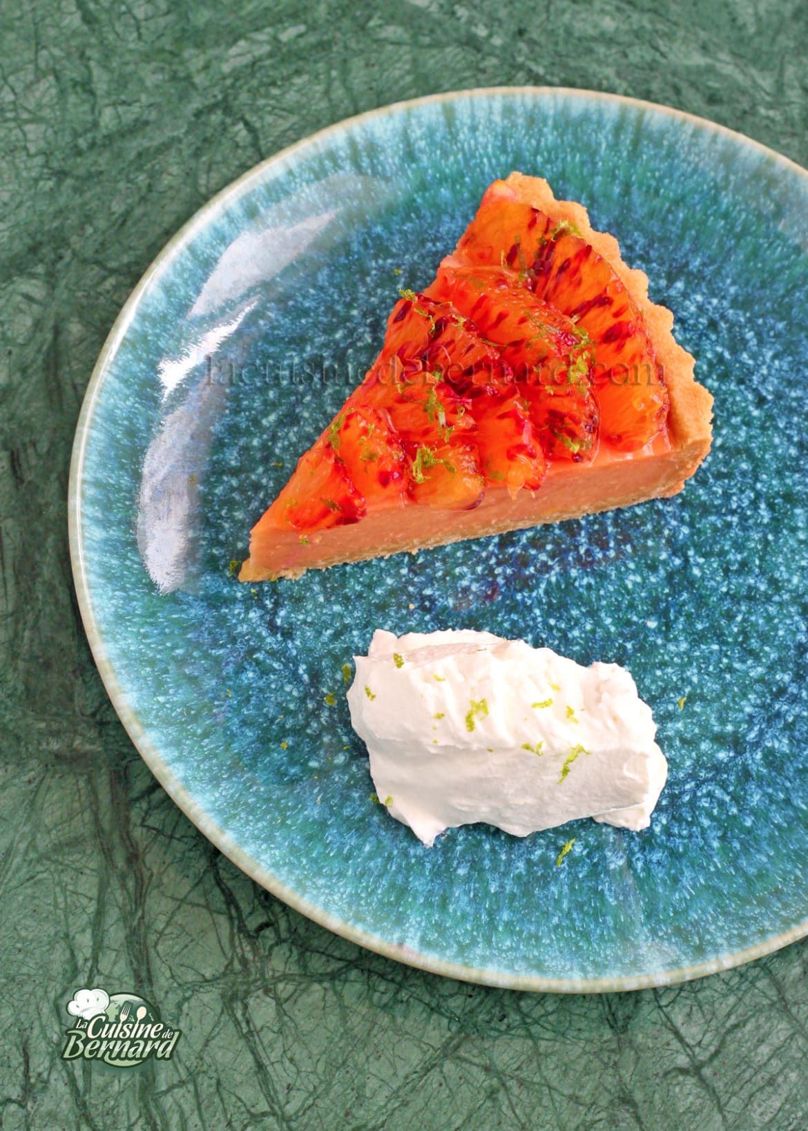 Une jolie tarte de saison à l’orange sanguine avec des suprêmes pour la décoration. J’ajoute dans ma crème, un peu de jus de citron vert et quelques framboises pour relever le tout et je verse le tout dans un fond de tarte cuite à blanc. Le résultat est crémeux et juteux, bien que croustillant à la fois ! Un vrai délice bien frais. Je vous conseille de la préparer la veille pour qu’elle soit bien froide et de la servir avec une chantilly au citron vert…