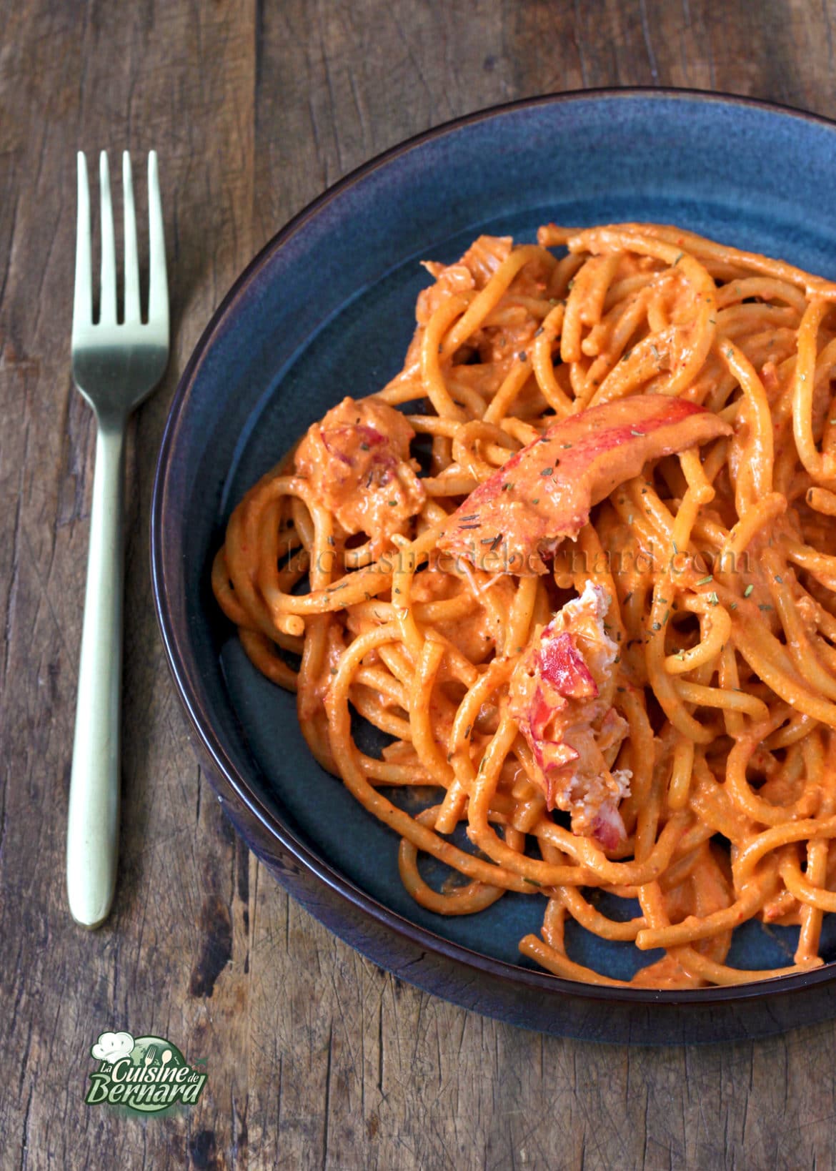 J’avais il y a un moment, dégusté dans un restaurant avec des amis, des pâtes au homard. Rien que le nom me donnait envie, mais l’addition fût salée ! Je me suis dit que j’allais tenter ma propre recette à partir de la recette de homards grillés de mes parents que je vous avais déjà postée il y a un moment sur mon blog de cuisine. C’est un peu une recette de fêtes, car je n’achète pas du homard tous les jours. Mais finalement, quand on voit que l’on obtient 4 généreuses portions, c’est très rentable ! Je pars donc du homard grillé, puis je poursuis la préparation en récupérant tous les sucs possibles que je fais réduire dans une sauce au goût hallucinant. C’est d’ailleurs frustrant que la photo ne rende pas justice à ce plat. Bon et puis je l’ai faite vite car je voulais surtout profiter de ce plat dont je me suis franchement régalé ! Mais je vous promets un plat absolument délicieux, entre le goût du homard grillé et flambé et la bisque. Les pâtes se gorgent de cette sauce riche et deviennent addictives !