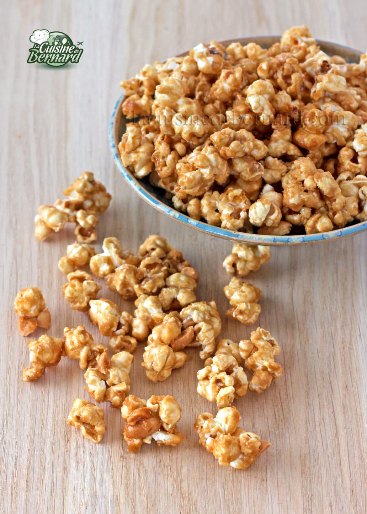 J’adore le pop corn et c’est tellement simple à faire chez soi en plus !! Une casserole avec un couvercle et le tour est joué ! Je l’aime salé ou sucré, mais mon petit pêché mignon est le pop corn au caramel, bien croustillant. Et avec des cacahuètes grillées, c’est alors un petit miracle ! J’ai mis du temps à mettre cette recette au point et j’y pensais depuis un moment. Pour trouver la bonne proportion de maïs et de caramel, puis d’obtenir un pop corn qui ne colle pas du tout aux doigts et qui reste bien croustillant, j’ai dû faire quelques essais. Pour cela, il faudra prendre la température précise du sirop, puis de passer le tout au four à basse température pendant 30 minutes pour bien sécher le caramel. C’est très simple à faire et en plus vous pourrez le conserver pendant près d’un mois ! Bon par contre le régime attendra !