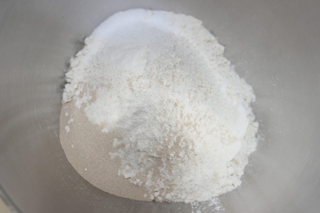 Versez la farine, le sel et la levure dans la cuve d’un robot. Mettez le sel d’un côté et la levure de l’autre, pour qu’ils ne ne touchent pas.