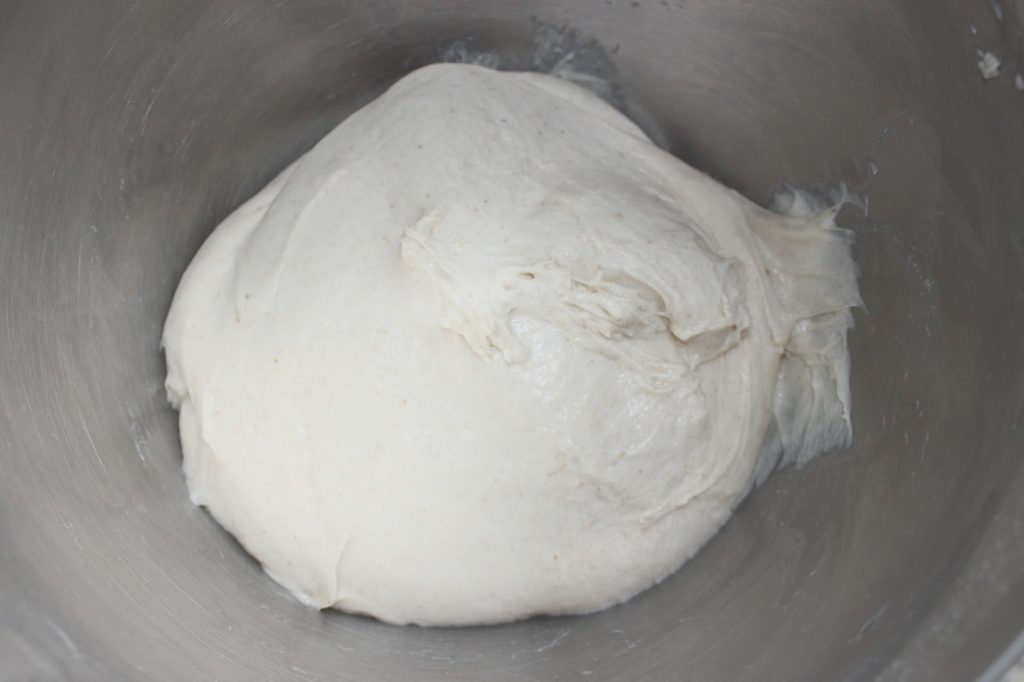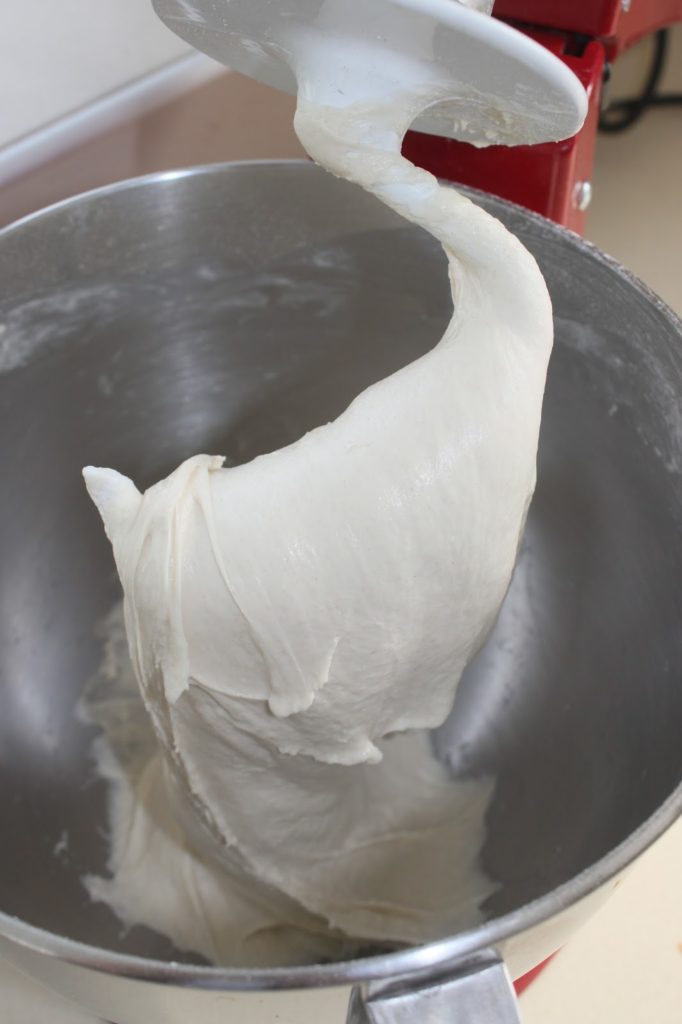 Au départ la pâte est très humide et au fur et à mesure du pétrissage, la levure s’active. La pâte va de plus en plus se décoller de la paroi de la cuve et « claquer ». J’arrête de pétrir quand elle se soulève presque entièrement du fond grâce au crochet.