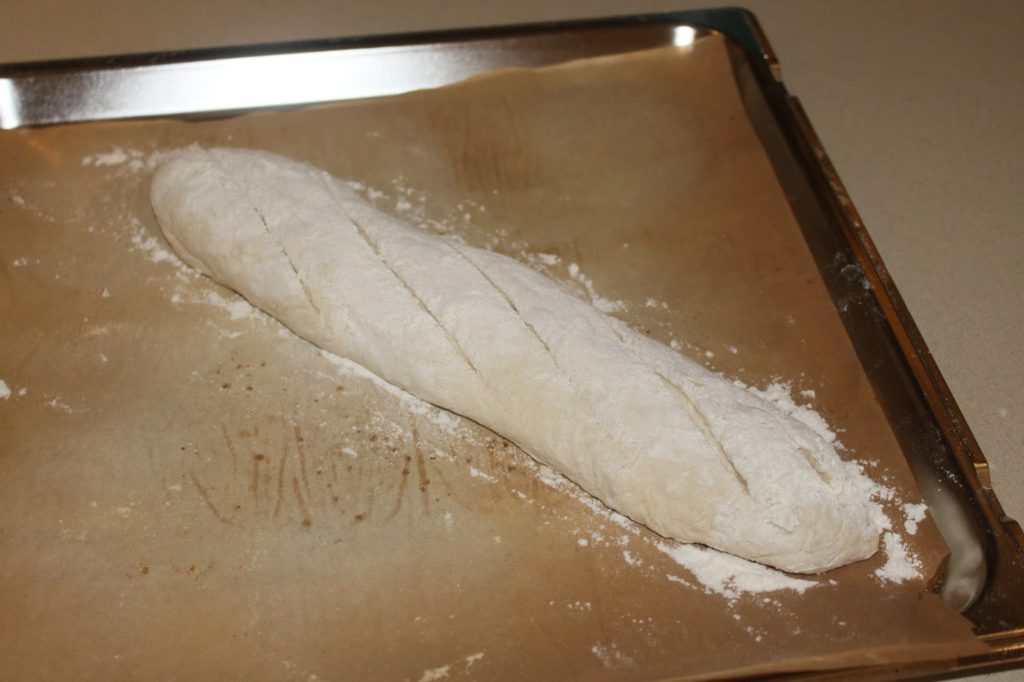 Laissez reposer une trentaine de minutes. Farinez la baguette (je prends pour cela un passe-thé). Je farine assez largement. Ne mettez pas juste un voile, n’ayez pas peur de recouvrir la pâte de farine. Puis coupez la pâte avec soit un excellent couteau, ou mieux, une lame de rasoir.