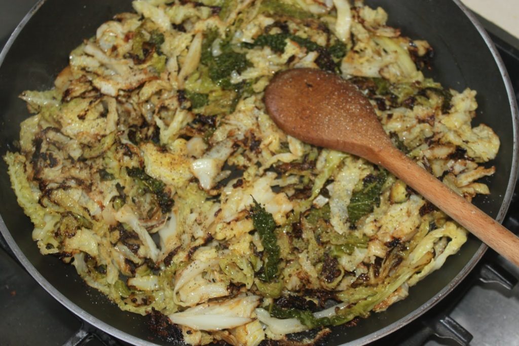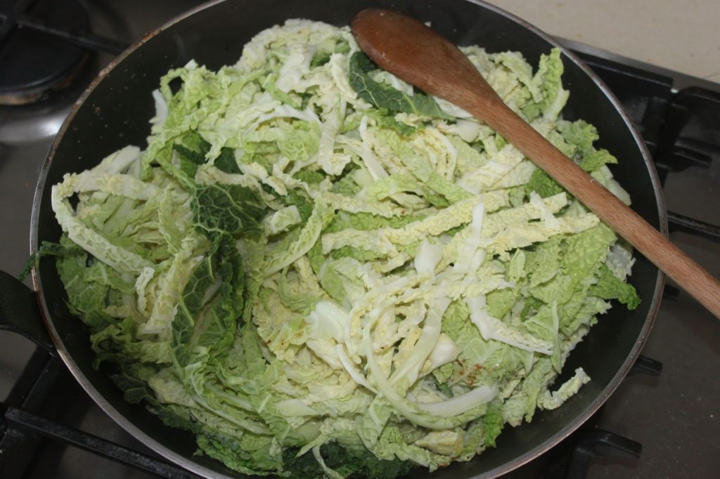 - Laissez cuire et mettez au besoin un couvercle pour cuire plus facilement ce chou qui ne fond pas beaucoup.