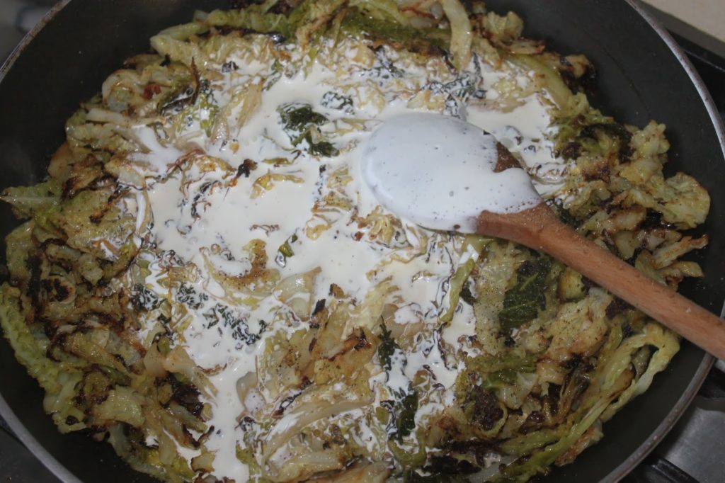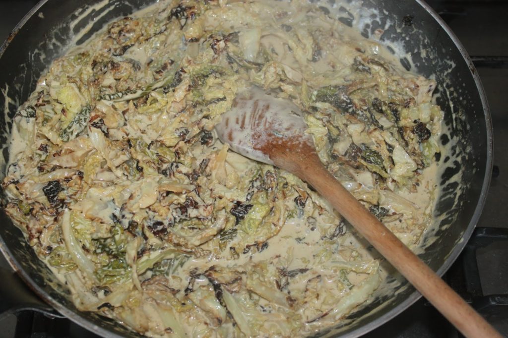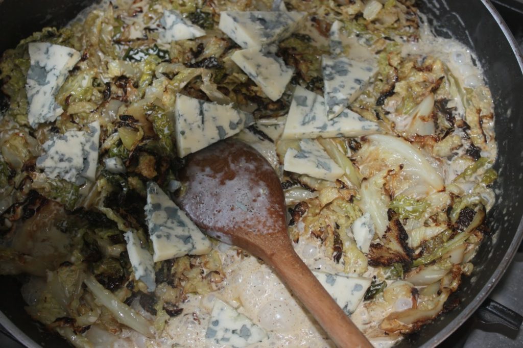 - Reversez-les dans la marmite et versez le chou vert à la crème de Fourme d’Ambert.