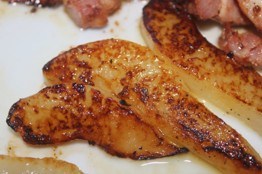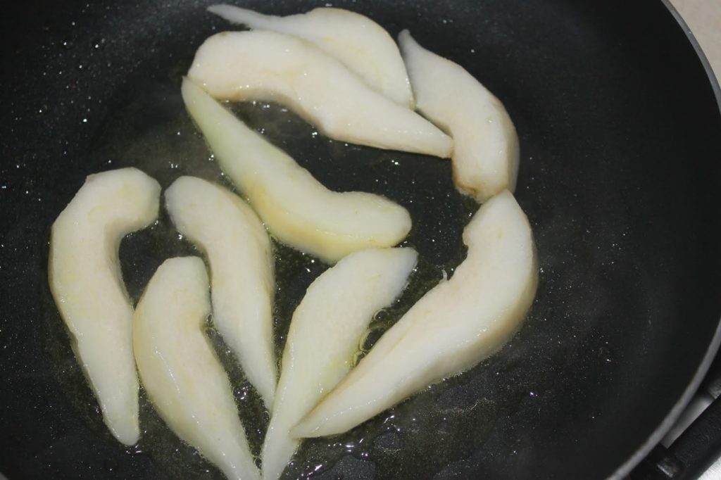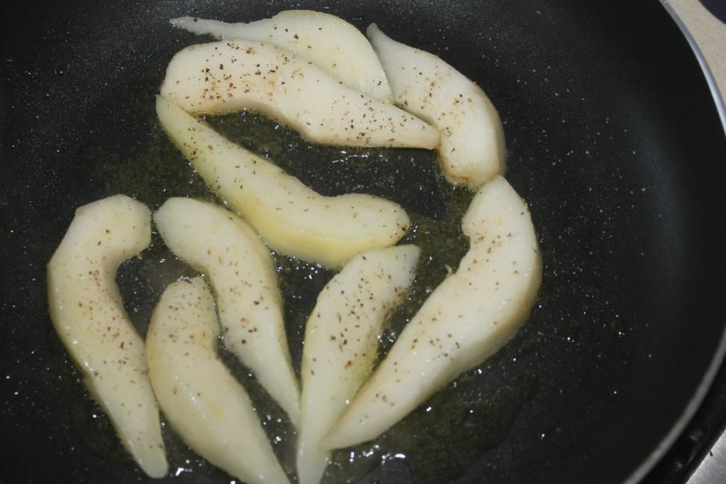- Recoupez chaque quartier en morceaux plus fins. Versez un peu d’huile d’olive dans une petite poêle et posez les morceaux de poire.