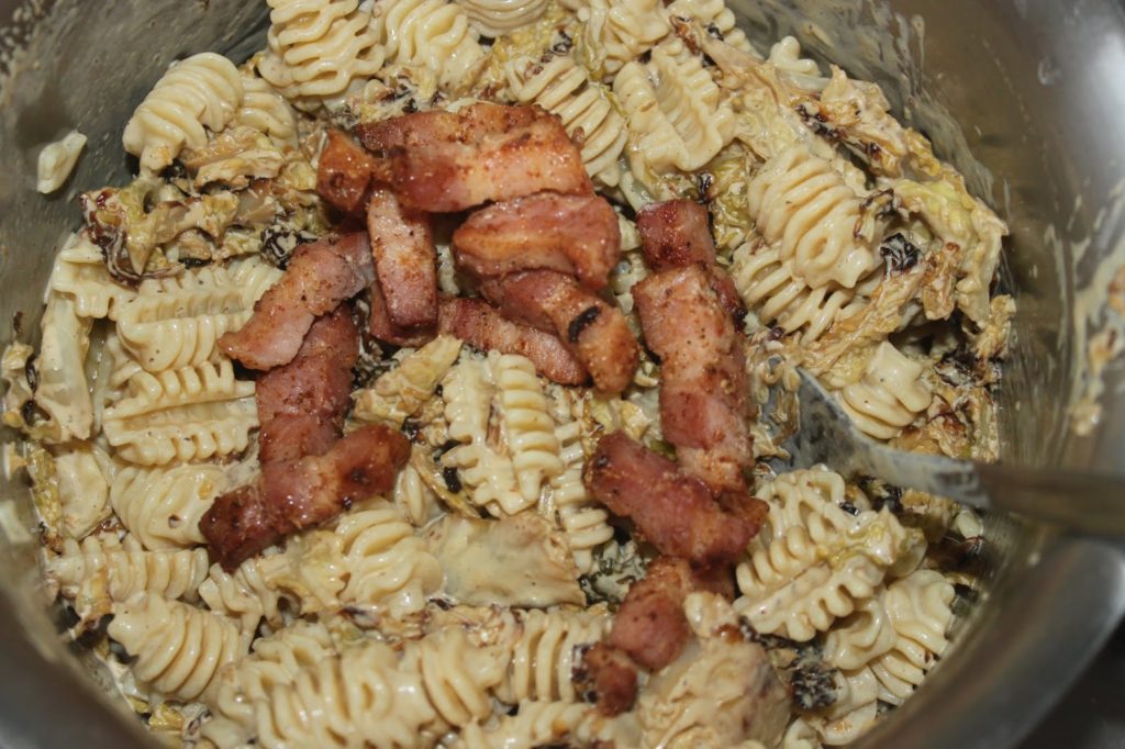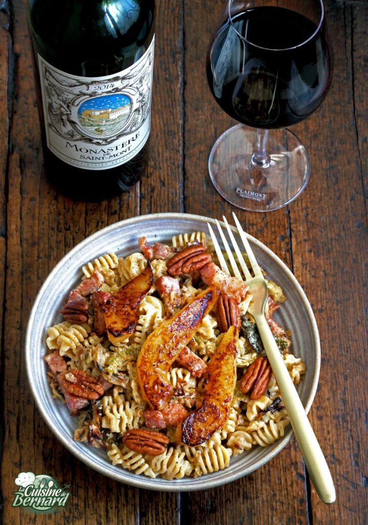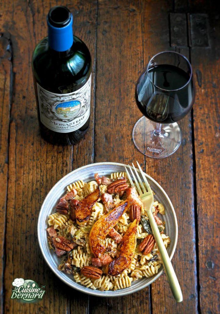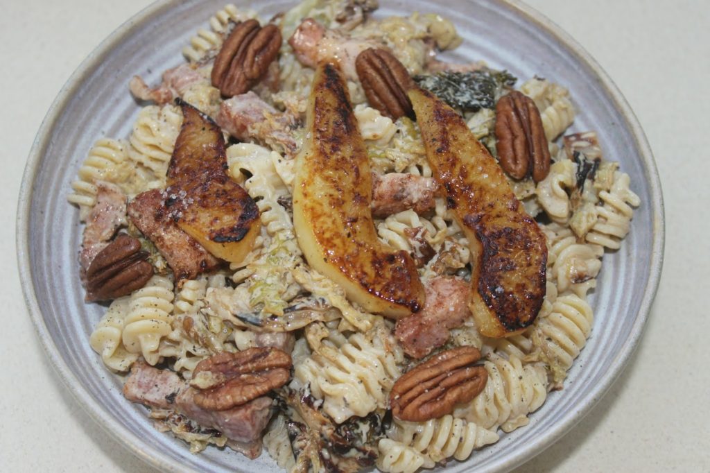 PÂTES AU CHOU VERT FRISÉ, FOURME D’AMBERT, POIRES ET NOIX DE PÉCAN :