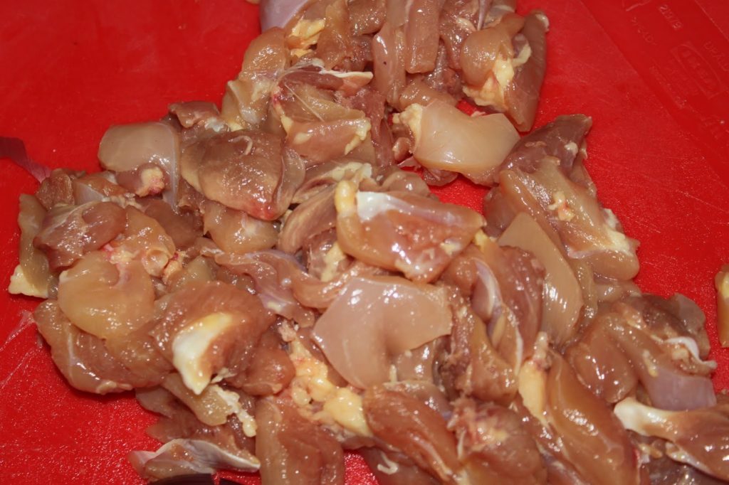 - Enlevez la peau et désossez les hauts de cuisses, puis coupez-les en morceaux.