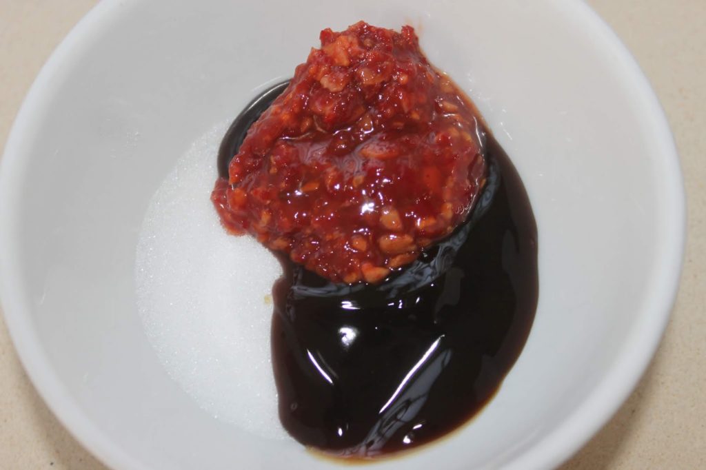 - Dans un bol, mélangez le sucre, la sauce d’huitre, l’eau et la sauce ail piment. Je prends la sauce ail piment de la marque Lee Kum Kee que je trouve dans les épiceries asiatiques. Il y a sans doute d’autres marques. Mais l’avantage est que celle-ci n’est pas trop forte !