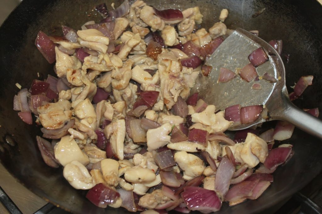 - Ajoutez alors le poulet en morceaux. Mélangez bien, toujours sur feu fort.