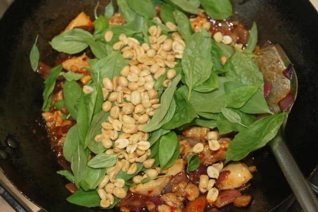 - Mélangez bien et faites cuire 3-4 minutes. Faites attention à ce que le tout ne brûle pas ! Ajoutez alors les feuilles de basilic thaï et les cacahuètes.