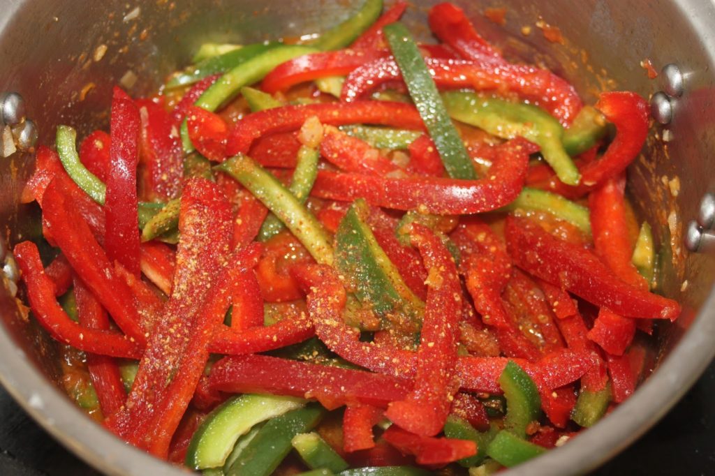 - Mettez cette fois les poivrons. Salez, poivrez et ajoutez un peu de piment d’Espelette.
