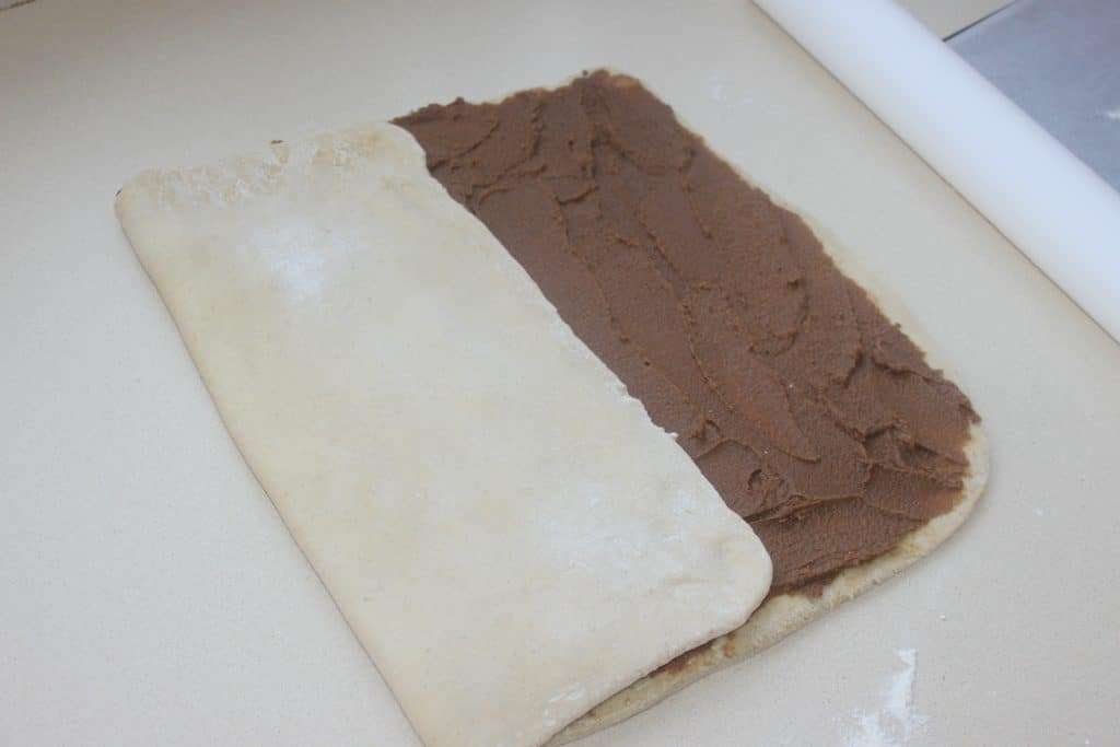 Espalhar a massa com o recheio, em ¾ da superfície: toda a largura deve ser espalhada, mas apenas ¾ do comprimento. Tentar ser o mais uniforme possível na espessura do enchimento.