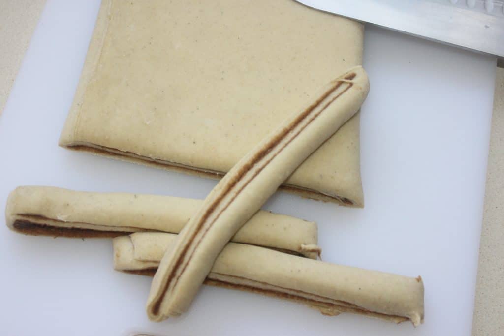 Tiras cortadas com uma faca de 2cm de largura e 14cm de comprimento.