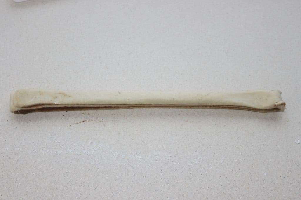 Dobrar a massa longitudinalmente em terços. Tem agora uma massa dobrada em terços, por isso 26 cm por cerca de 14 cm.