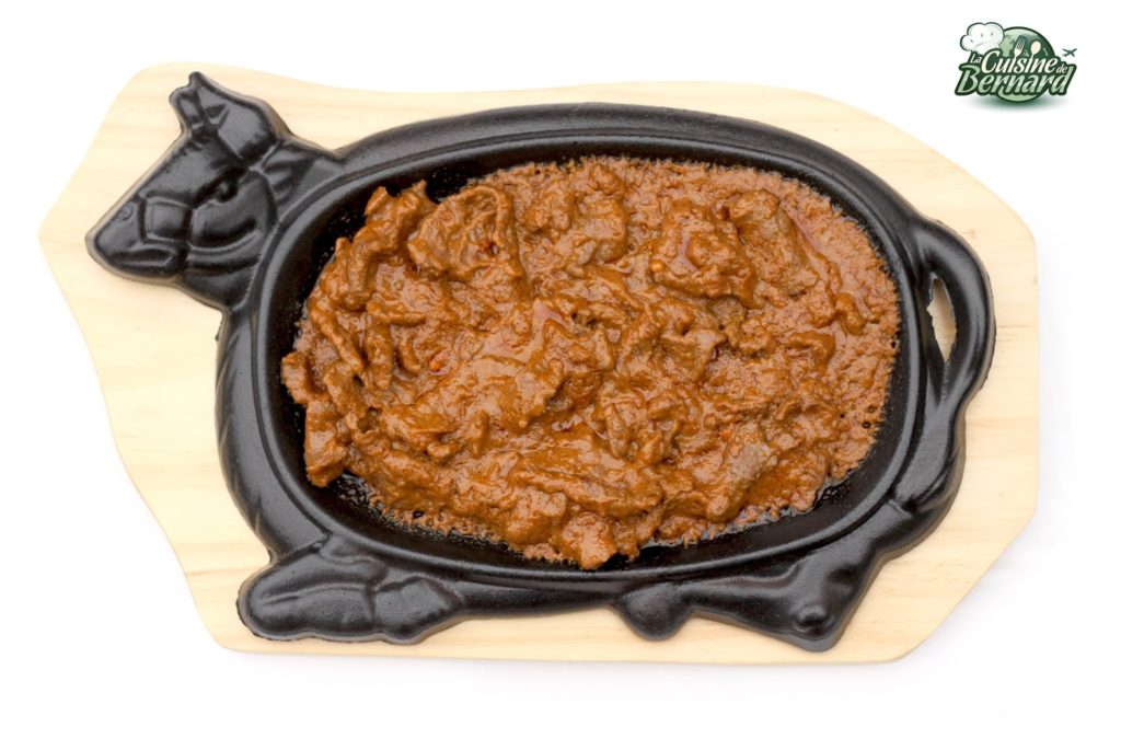 Oui c’est fait ! Je l’ai acheté ce plat en fonte kitschissime !! Depuis le temps que je voulais un plat sur plaque chauffante comme au restaurant… Je vous ai craqué la recette de la poudre de saté pour pouvoir la refaire à la maison, même si celle-ci n’est pas très chère en épiceries asiatiques. Ce bœuf est très savoureux et la sauce caramélise sur la plaque brûlante. Cette plaque fait le show, mais vous pouvez vous en passer et servir la viande normalement. Mais avec elle à table, devant tout le monde, le bœuf frétille, la sauce grésille, les bouches salivent !