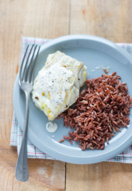 - Servez le cabillaud en l'arrosant de crème onctueuse et parfumée et accompagnez-le de riz rouge très chaud !