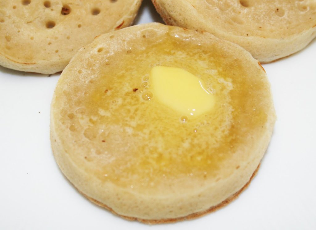 - Il faut laisser cuire jusqu’à ce que la surface soit cuite. On peut les retourner quelques secondes pour finir la cuisson mais en général les crumpets ne sont cuits que sur une seule face. Mais même certains anglais les font parfois des deux côtés… Moi je préfère une seule face et l’autre bien blanche et pleine de trous à remplir de beurre salé !