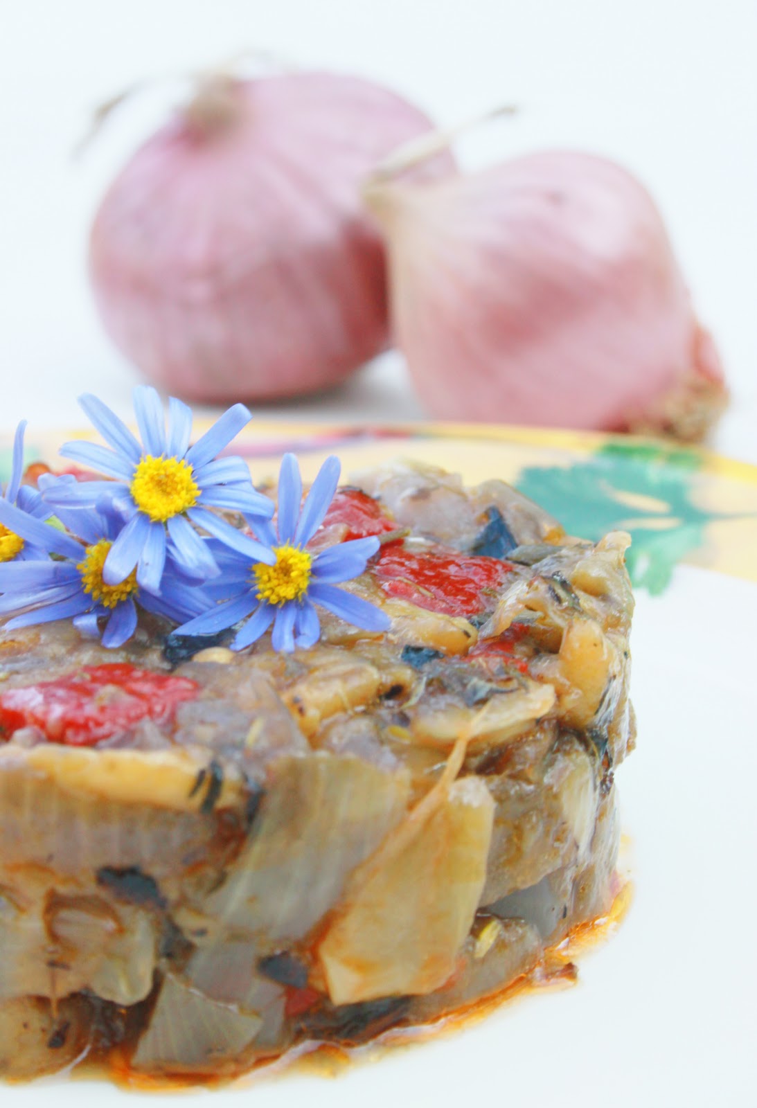 J’ai hésité à mettre cette photo pour illustrer la recette! Ces petites fleurs font sans doute kitsch, mais je voulais simplement donner un air provencal avec ces couleurs. Alors j’assume ma photo kitsch! Ces légumes grillés du soleil ressemblent à une ratatouille, mais il n’y a dans cette recette, que trois légumes. Des oignons rouges caramélisés au four, des aubergines grillées à l’huile d’olive et des piquillos. Une recette simple, un peu longue à préparer (surtout une cuisson longue) mais qui est tellement savoureuse que j’ai le plaisir de la partager avec vous. Je souhaite remercier mon amie Monique, une des « Reines » (le lieu où je donne mes cours de cuisine) qui a gentiment accepté que je publie sa recette sur le blog. J’avais eu la chance de découvrir sa recette chez « Les Reines » et lorsque je l’ai goûtée, j’ai tout de suite su que j’allais devoir vous la faire découvrir! Ces légumes sont tout autant délicieux chauds, que froids.