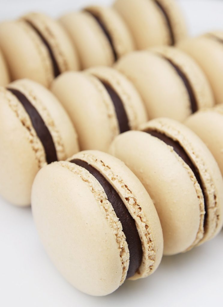 Voici une nouvelle recette de macarons! Je vous propose ma version café-chocolat. Il s’agit cette fois de coques de macarons aromatisées au café (la couleur est du coup naturelle) avec une ganache moelleuse au chocolat doux et au café. L’un est l’autre créent une osmose parfaite, un arôme corsé mais suave pour ces macarons ambrés et délicieusement chocolatés!