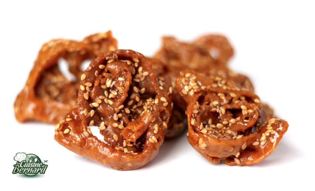 Voici les « Mkharkas » ou « Chebbakias » suivant les régions où on les trouve. Cela doit avoir encore d’autres noms. Je suis souvent passé devant ces petites pâtisseries lors de mes voyages au Maghreb et je n’avais jamais été vraiment tenté de goûter. Allez savoir pourquoi! Je ne sais vraiment pas ce qui m’a pris durant toutes ces années. Pourtant cela correspond à tout ce que j’aime: une recette ancestrale, des épices, un pliage particulier… Mais au moins, j’ai attendu d’aller au Maroc chez Lalla Myriam, qui me les a préparés avec l’aide de sa maman, pour goûter ces délices. Nous nous sommes retrouvés ensemble à préparer et à plier la pâte. Cela demande un peu de temps et de patience, mais le résultat vaut largement le travail. C’est surtout le pliage qui demande de la besogne. Une petite douceur aux parfums de sésame, de cannelle, d’anis, d’huile d’olive, de miel et de fleur d’oranger… Cela me laisse encore rêveur et j’ai le plaisir de partager avec vous aujourd’hui cette merveilleuse recette grâce aux merveilleuses Touria, Lalla Myriam et Lalla Fatima!