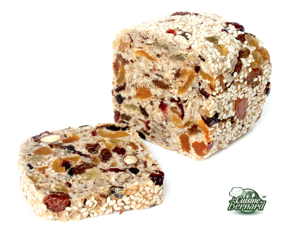 L’autre jour, j’étais à Amsterdam et j’ai découvert dans un magasin, ce petit pain au muesli, très riche en fruits secs. J’ai tout de suite adoré son poids. Je n’ai pas fait le test, mais je suis presque sûr qu’il coule dans l’eau ! Plus proche d’un gâteau que du pain, il est dense et terriblement délicieux. Ni une ni deux, dès que je suis arrivé chez moi, j’en ai composé une recette quasi similaire. Son unique secret: le pourcentage de fruits. Il y en a en effet plus de la moitié ! Il est parfait pour le petit déjeuner ou le goûter et vous pourrez varier à l’infini la composition des fruits.