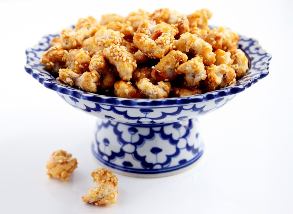 Lors de mes séjours à Bangkok, je ne manque jamais d’acheter ces pralines aux noix de cajou et sésame, qui sont légèrement caramélisées et surtout très croquantes! Le sucre est salé pour exciter encore plus nos papilles. Je vous propose cette recette surtout pour me faire plaisir, car maintenant je peux me préparer et offrir ces pralines thaïlandaises sans avoir besoin de traverser le globe! Il n’y a ici aucune difficulté et les noix de cajou crues et les graines de sésame non grillées se trouvent dans tous les magasins « bio » ou dans les supermarchés asiatiques. Mise en garde: cette recette est très rapidement addictive. Des effets secondaires sont à prévoir, comme un manque, une envie compulsive de finir le bol, un énervement violent de voir sa boutique « bio » fermée…