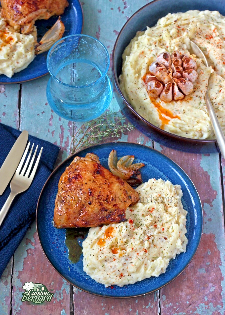 - Servez la purée bien chaude avec le poulet, des morceaux d’oignons et des gousses d’ail de la tête restante. Bon appétit !