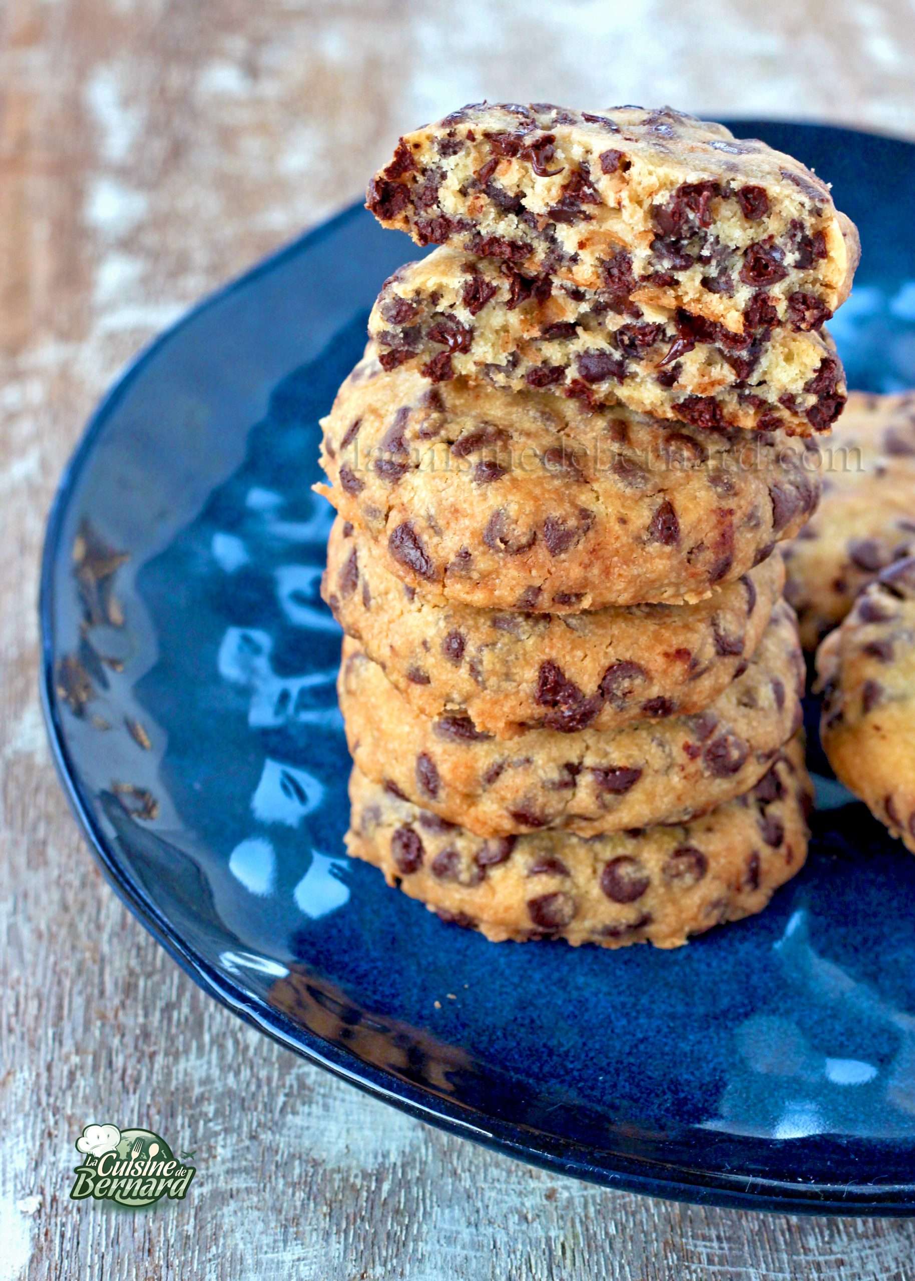 De gros sablés, blindés de chocolat, bien croustillants et fondants à la fois ! On dirait des cookies, mais ce n’est pas le cas. La texture est vraiment celle d’un sablé ou d’un shortbread, plus craquante que le cookie. Il n’y a ni œuf, ni vanille. Et je mets une dose énorme de chocolat : c’est la moitié du poids de ces petits gâteaux ! Pour les amoureux des bonnes choses et surtout de chocolat (noir ou lait !).