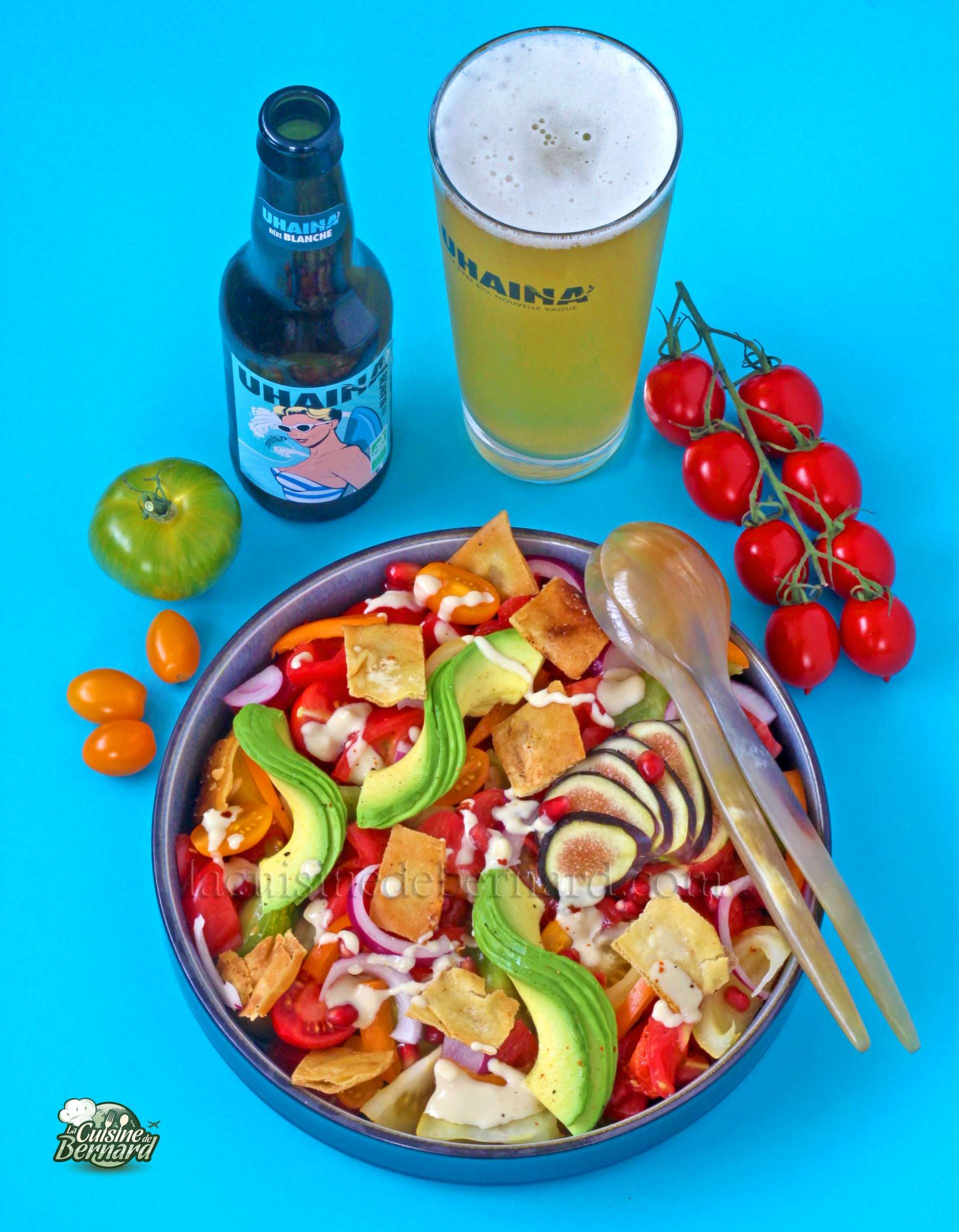 C’est parti pour 3 recettes en partenariat avec la bière bio Uhaina ! J’adore la bière bien glacée en été et on m’a proposé de créer 3 recettes ensoleillées pour cette marque française originale et bio. On commence par la blanche avec une salade colorée et craquante, pleine de bonnes choses, de textures étonnantes et de saveurs délicieuses. Je vous propose une salade de tomates, avec des avocats, des figues, du poivron, des graines de grenade, des oignons rouges, du pain libanais croustillant à l’huile d’olive, mais surtout une très savoureuse sauce à la crème de sésame !