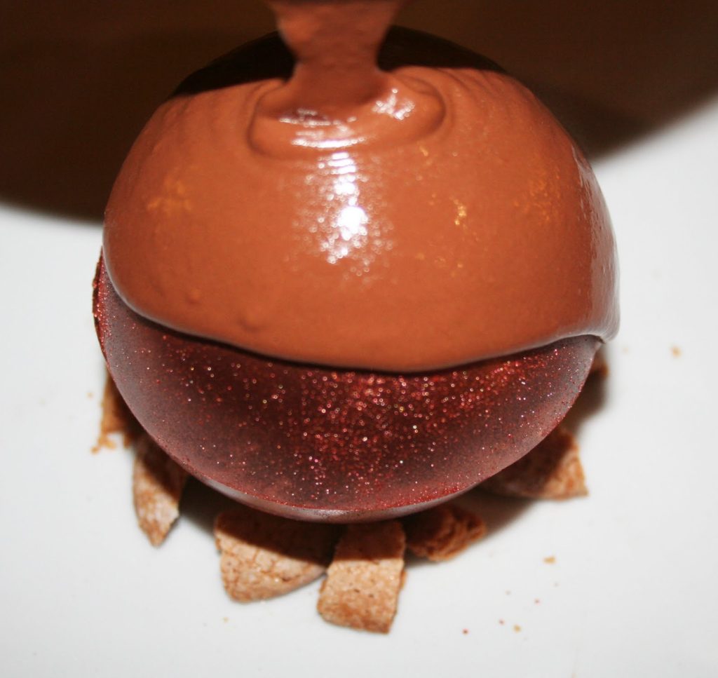 - Préparer les 3 autres sphères de la même façon puis verser la sauce au chocolat chaude sur les sphères devant les convives. Les sphères vont alors casser et fondre pour révéler leur intérieur secret ! Effet spectaculaire garanti !